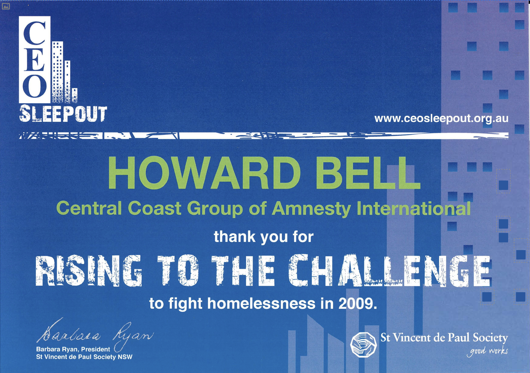 Certificate for participating in the St Vincent de Paul CEO Sleepout representing Amnesty and raising funds for the homeless