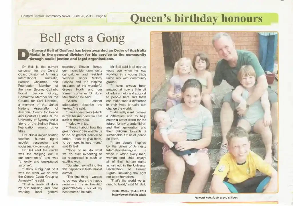 Dr Howard Bell of Gosford has been awarded an Order of Australia Medal in the general division for his service to the community through social justice and legal organisations.